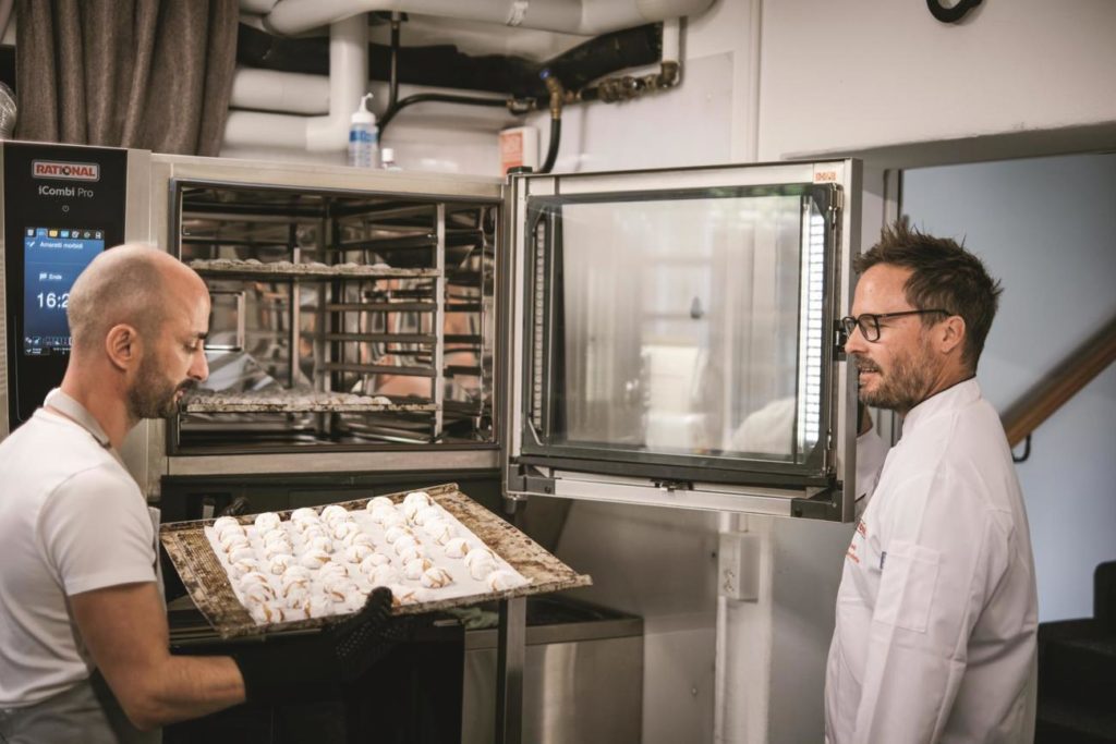 Es sei keine einfache Aufgabe, sagt Ariano. «Wir wissen alle, dass traditionelle Bäckereien einen schweren Stand haben. Wir leben von der Unterstützung der Menschen in unserer Umgebung – ohne sie wäre unser Konzept nicht möglich.» Im Genusswerk ist alles handgemacht, vom Gipfeli über die Brote, Sauerteigbrote, die Patisserie und Pralinen bis hin zu den Glaces. Im Bistro geniessen die Gäste nicht nur ein Frühstück der Spitzenklasse, sondern auch hausgemachte Mittagsgerichte der besseren Art. Dafür hat Ariano in der knapp acht Quadratmeter grossen Küche einen weiteren Alleskönner von Rational installiert. Mit dem Kochsystem «iVario Pro» werden morgens die Saucen angesetzt, während des Service dient das System als Pastakocher, in dem die hausgemachte Pasta à la Minute frisch gekocht wird, und nachmittags produzieren die Mitarbeitenden damit bereits Komponenten für den nächsten Tag. «Konkret ersetzt der ‹iVario Pro› bis zu fünf Geräte in meiner Küche», so Ariano.